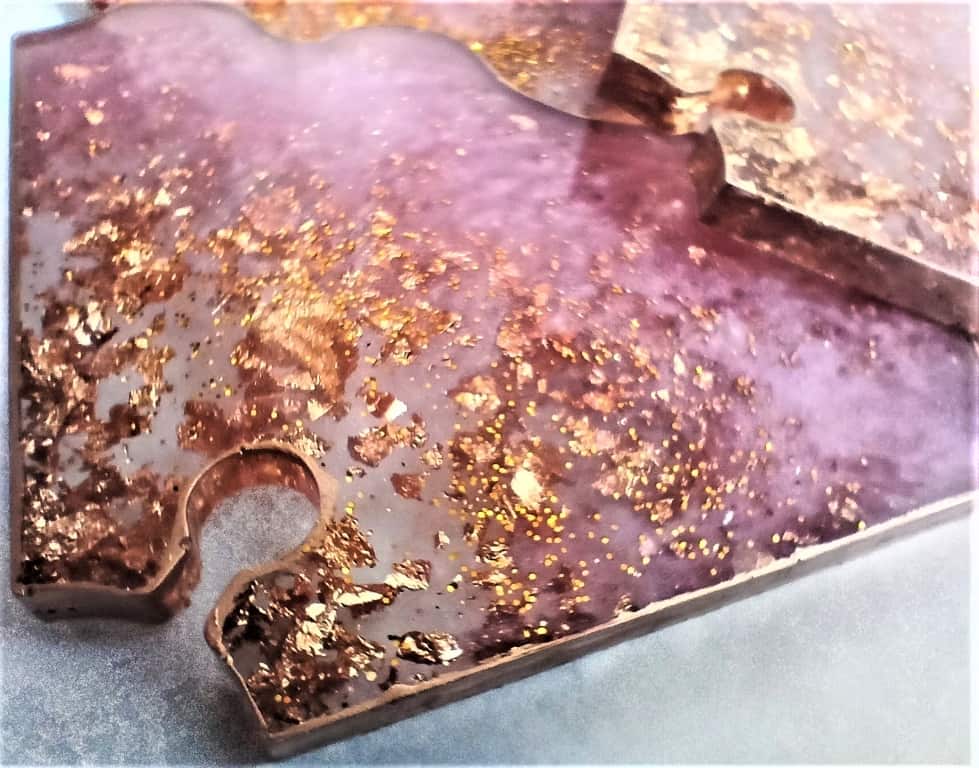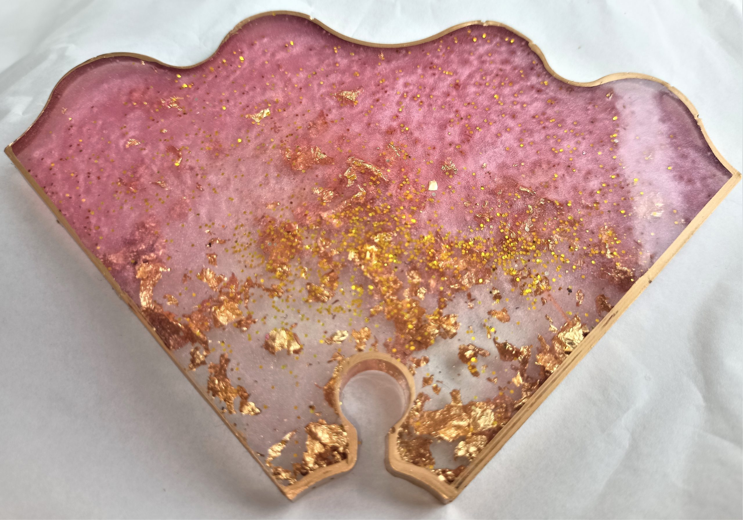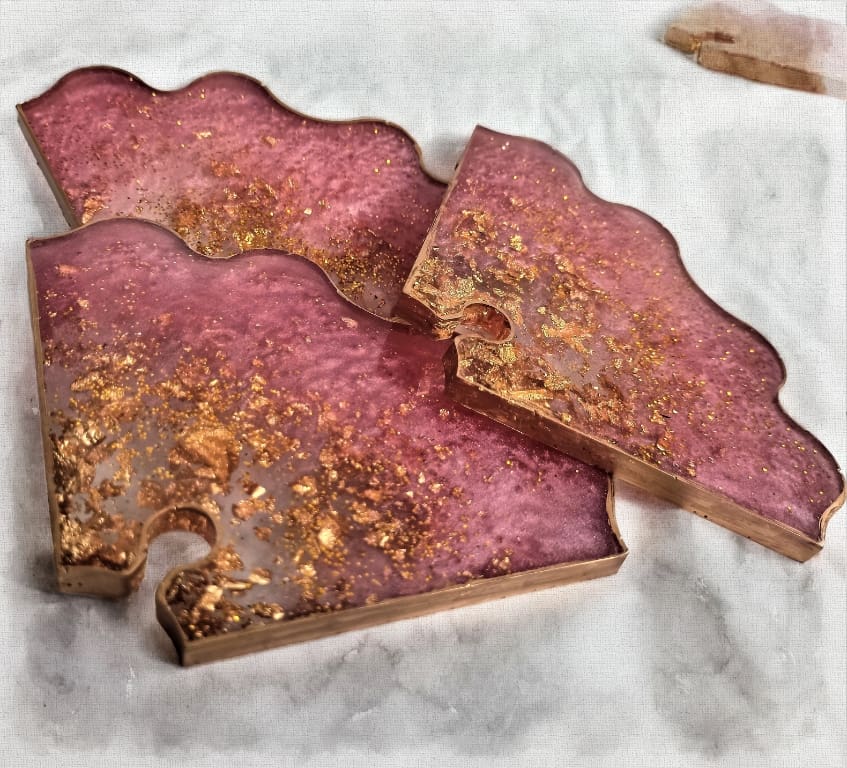 They are handcrafted in pink and clear resin with gold leaf flakes and gold edges and match our coasters and wine butler perfectly.